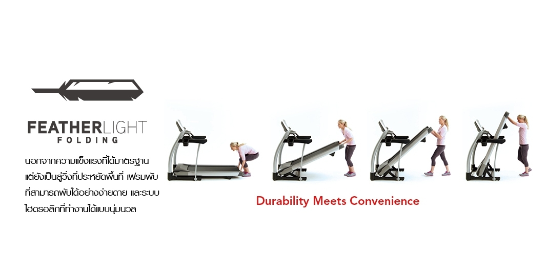. เทคโนโลยี FeatherLight ที่สามารถพับได้และฟัก์ชั่นล้อหน้าทำให้ง่ายและสะดวกในการจัดเก็บลู่วิ่ง